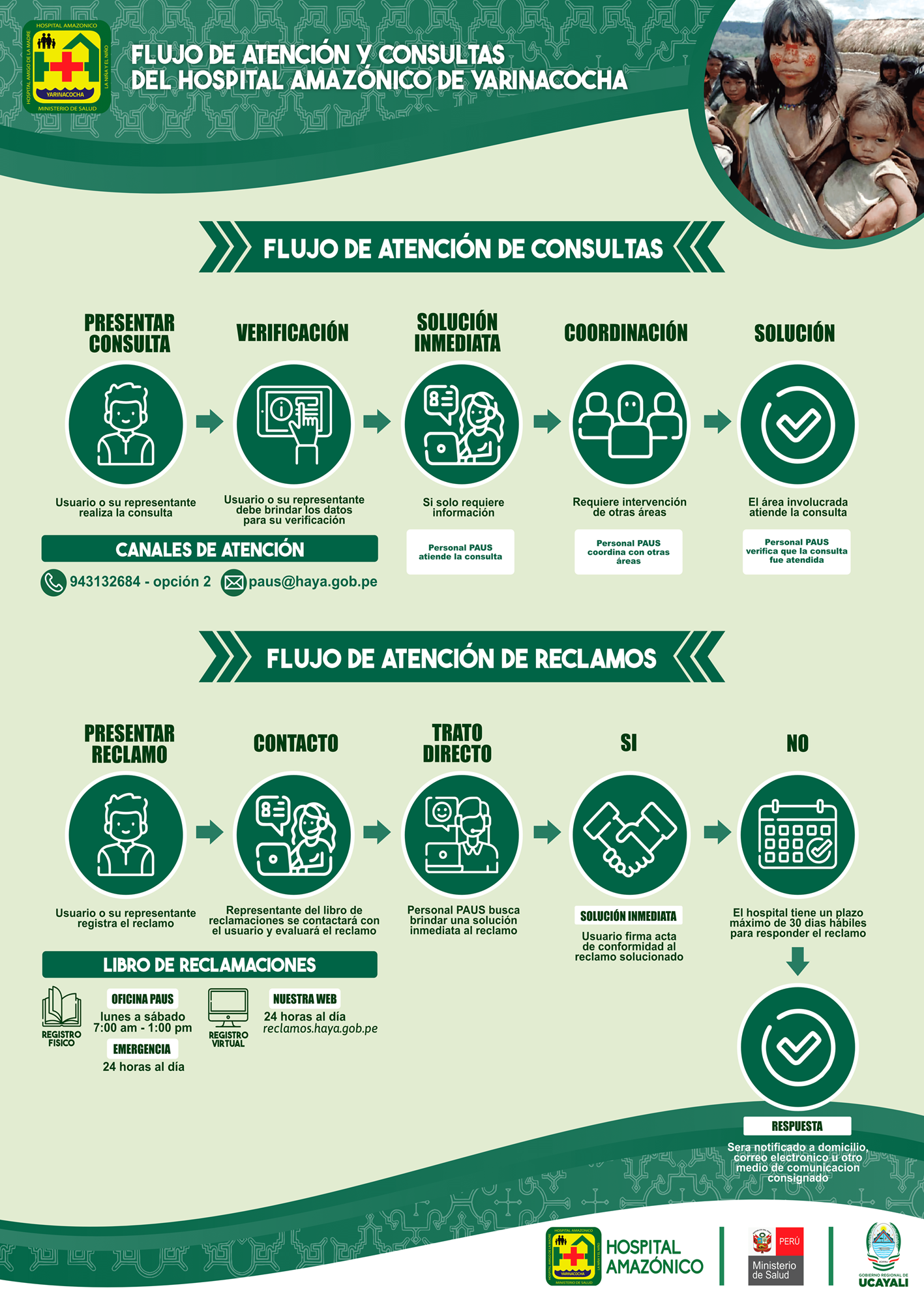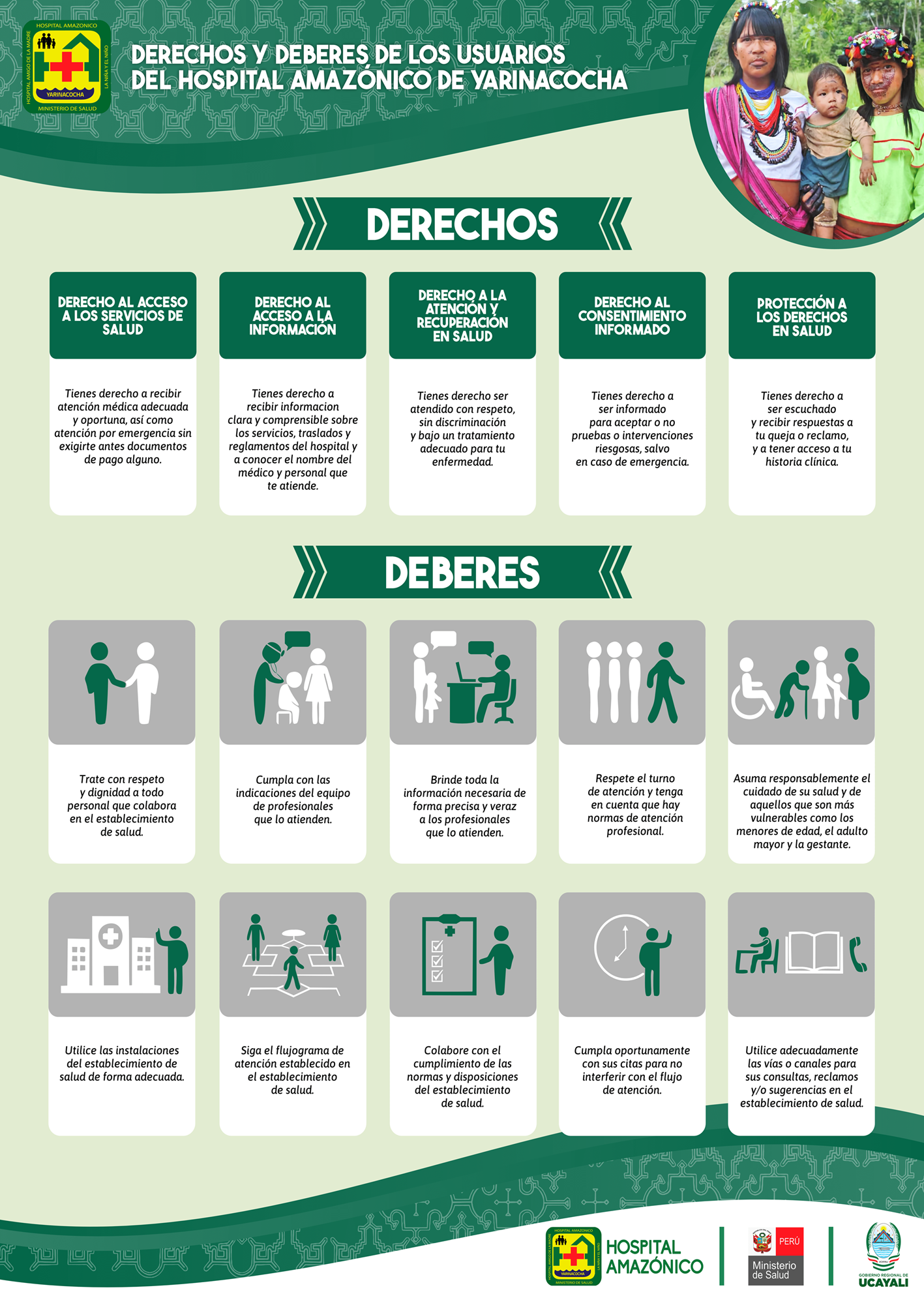Bienvenido a nuestro módulo de Atención al Usuario Virtual del Hospital Amazónico, en este módulo podrás conocer tus deberes y derechos como usuario de nuestro servicios en Salud, así como nuestra Plataforma de Atención al Usuario en Salud, Libro de Reclamaciones en Salud (Físico y Virtual), proceso de atención, gestión, mejoras continuas y hacernos llegar tus consultas o sugerencias.